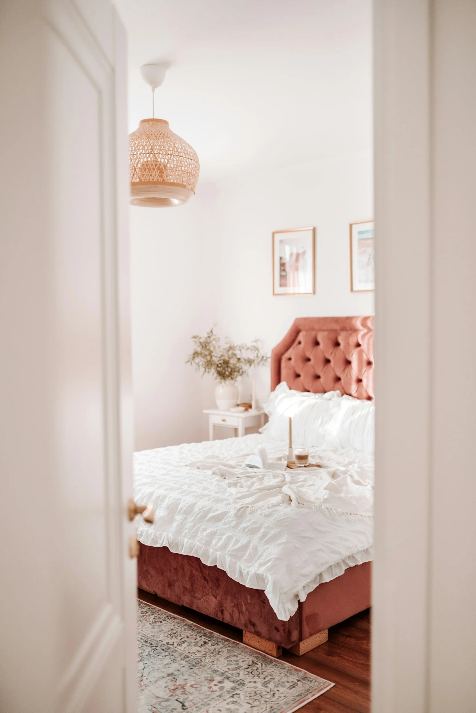 A few thoughtful touches such as a festive candle, a small glass of winter foliage or a pretty tray with snacks and a water carafe, all create a boutique hotel feel.